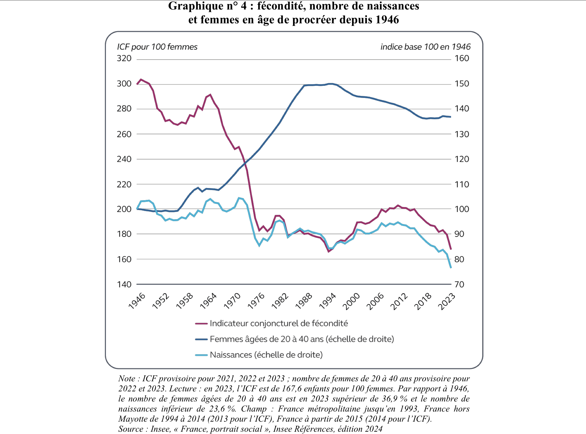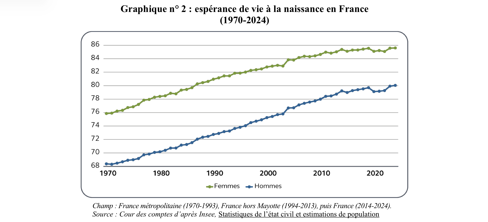 En 2024, l’espérance de vie à la naissance atteint un niveau historiquement élevé : 85,6 ans pour les femmes et 80,0 ans pour les hommes, soit un gain d’environ 20 ans par rapport à 1946.